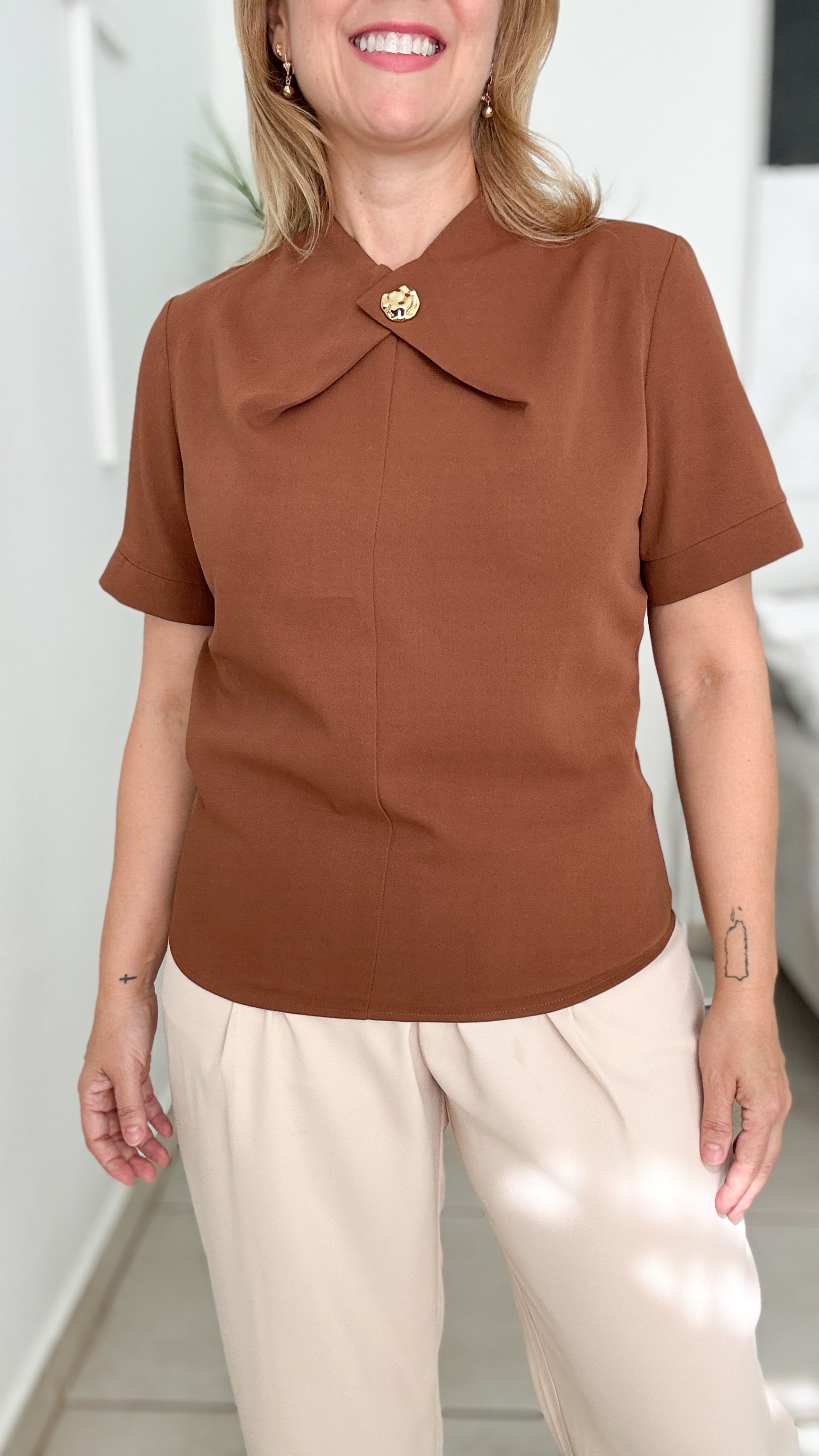 Elevate your look with this rich chocolate-colored shirt, highlighted by a striking golden button at the center of the chest. Sophisticated yet bold, it’s the perfect statement piece for effortless style with a touch of luxury.